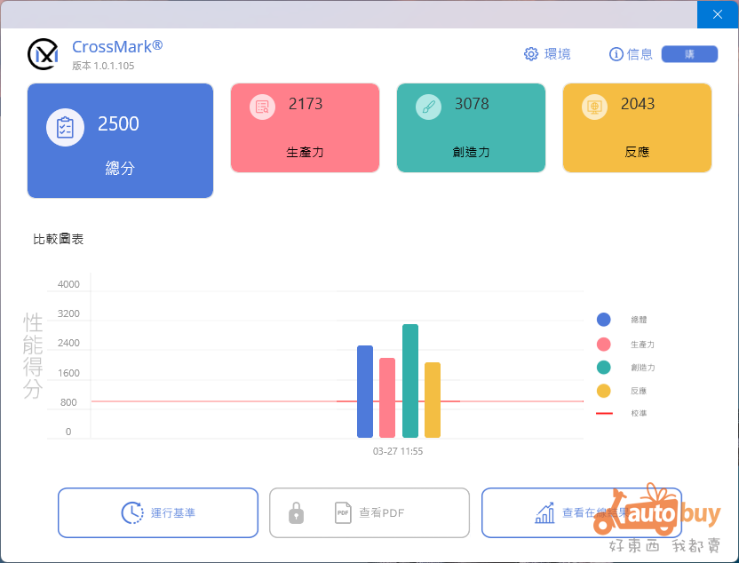 CrossMark 與前述的 PCMark 10 性質相近,同樣以模擬日常使用情境為核心,著重評估系統在實際應用中的整體表現。在本次測試中,測試平台取得 2,500 分的成績,展現出穩定且均衡的整體運算效能。