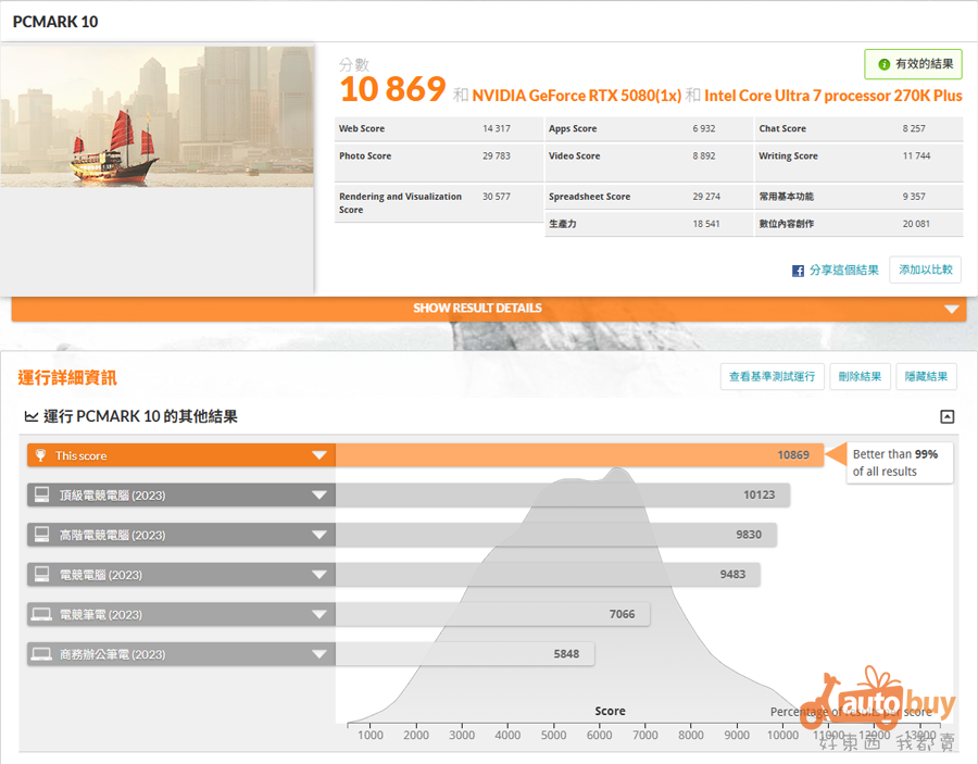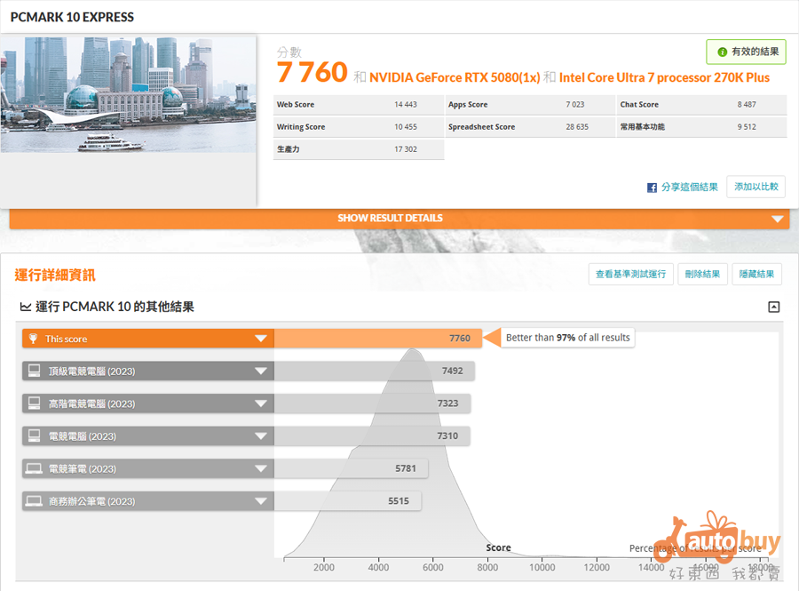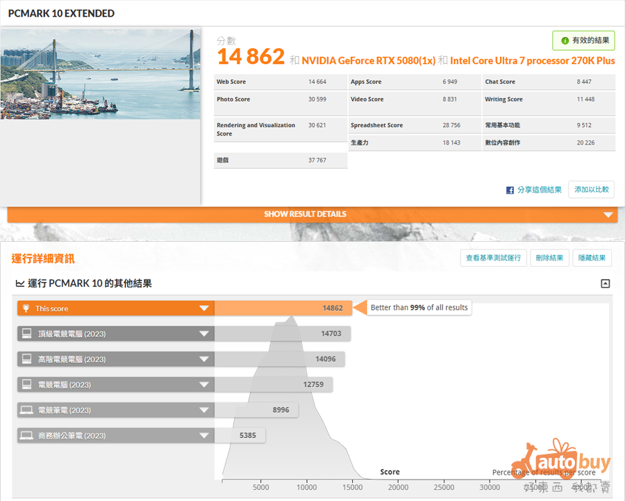 在本次測試中,測試平台於 PCMark 10 綜合項目取得 10,869 分;於 PCMark 10 Express 與 Extended 測試中,則分別獲得 7,760 分與 14,862 分的成績。其中,Express 測試的 PR 值超過 97%,其餘兩項測試更皆突破 PR 99%,整體表現相當亮眼,展現出優異的日常應用與多工處理能力。
